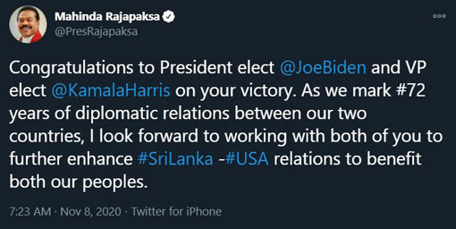 “Congratulations to President elect @JoeBiden and VP elect @KamalaHarris on your victory. As we mark #72 years of diplomatic relations between our two countries, I look forward to working with both of you to further enhance #SriLanka-#USA relations to benefit both our peoples.”